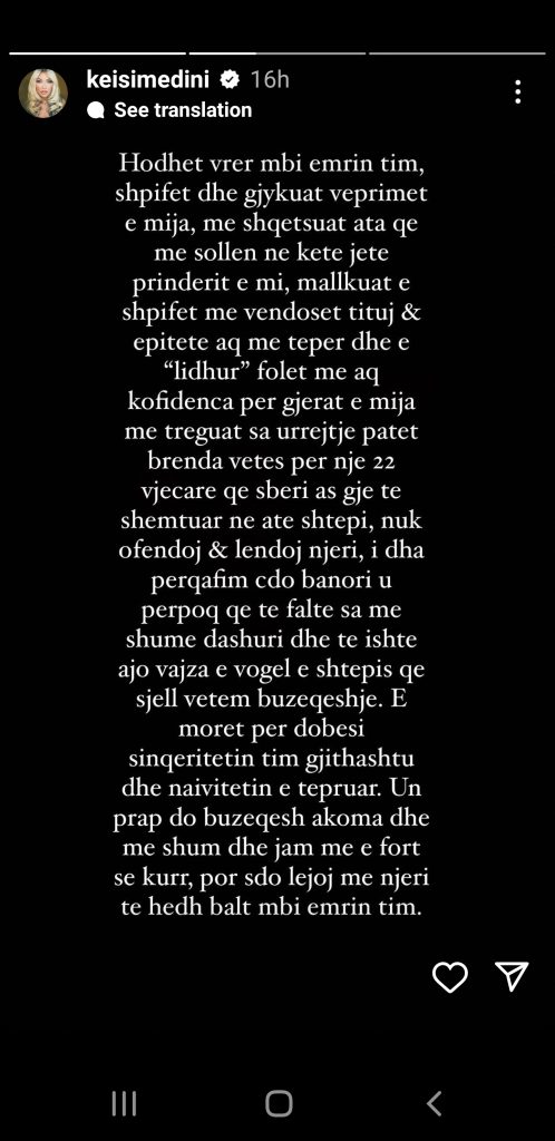 Keisi Medini ka reaguar me një mesazh të fortë për të gjithë ndjekësit dhe personat që hodhën baltë mbi emrin e saj gjatë qëndrimit në Big Brother Vip.