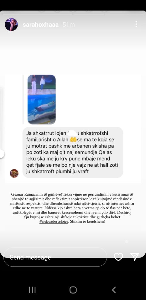 “Gëzuar Ramazanin të githëve! Teksa vijmë në përfundimin e kërij muaji të shenjtë të agjërimit dhe reflektimit shpirtëror, le të kujtojmë rëndësinë e mirësisë, respektit dhe dheshmbshurisë ndaj njëri-tjetrit, si në internet ashu edhe në të vërtetë. Ndërsa kjo është hera e vetme që do të flas për këtë, unë kolegët e mi dhe banorët kërcënohemi dhe fyhemi çdo ditë. Dëshiroj t’ju kujtoj se është një shfaqje televizive dhe gjithçka bëhet në kuadër të lojës. Shikim të kendshëm!”, shkruan Sara Hoxha.