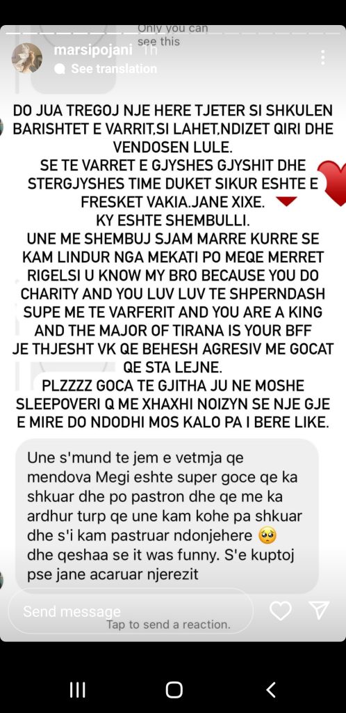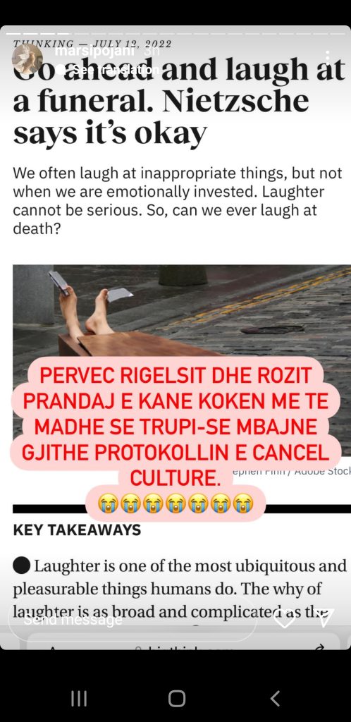 “Përveç Rigelsit dhe Rozit, prandaj e kan kokën më të madhe se turpi, se mbajnë gjithë protokollin e cancel culture”, shkruan Marsi.