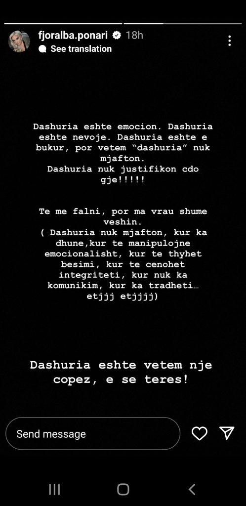“Dashuria është emocion. Dashuria është nevojë. Dashuria është e bukur, por vetëm “dashuria” nuk mjafton. Dashuria nuk justifikon çdo gjë! Të më falni, por ma vrau shumë veshin. Dashuria nuk mjafton, kur ka dhunë, kur të manipulojnë emocionalisht, kur të thyhet besimi, kur të cënohet integriteti, kur nuk ka komunikim, kur ka tradhëti etj. Dashuria është vetëm një copëz, e së tërës!” shkruan Fjoralba në InstaStory.