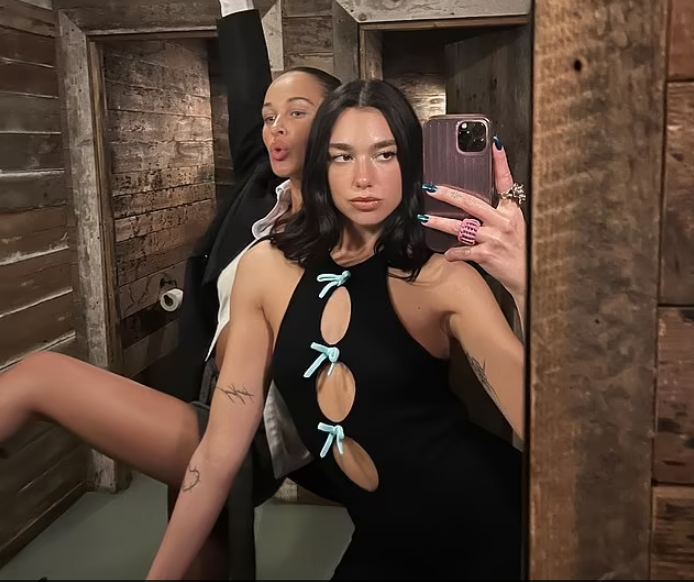 Bukuroshja i ka stiluar flokët e saj të errët në një ndarje në qendër, ndërsa ato kaluan pranë shpatullave të saj në kaçurrela të lirshme. Artistja fituese e disa çmimive u përpoq për një pamje natyrale të grimit teksa shfaqte trupin e saj të tonifikuar. Në një foto, Dua pozoi së bashku me një mik për një selfie në pasqyrë.