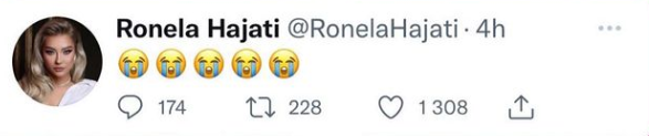 Pas “censurimit” të fotove të marra gjatë provave zyrtare ka ardhur edhe një reagim i këngëtares në Twitter. Ajo ka postuar disa emoji duke qarë e ka lënë të kuptohet që është mjaft e mërzitur nga kjo situatë.