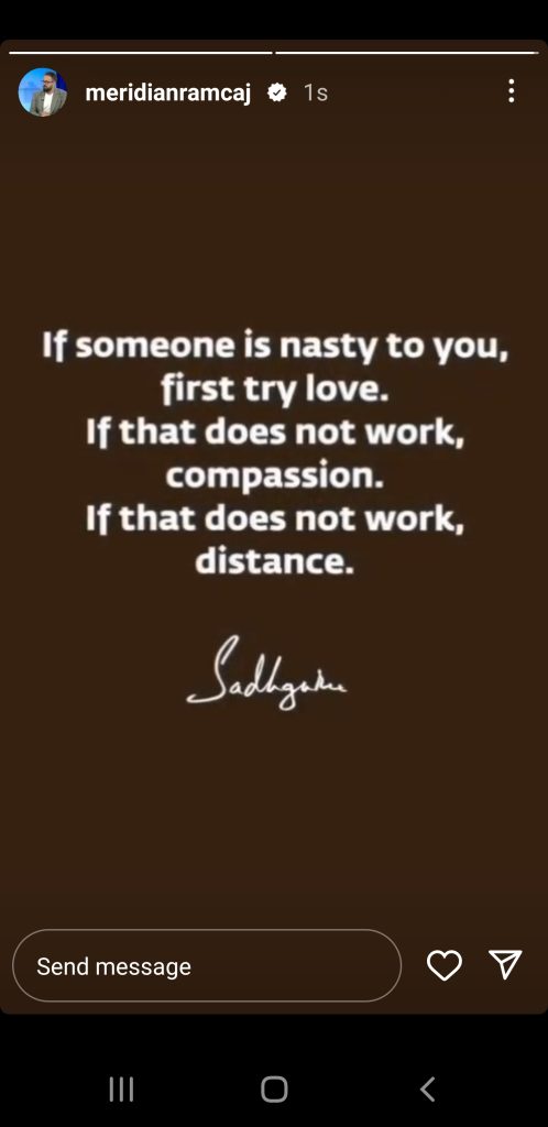 Ndërkohë, kanë mjaftuar pak orë dhe shumë reagime në rrjet nisur nga deklarata e Ejllit, që edhe vetë Meridiani të shprehej në lidhje me marrëdhënien e tyre. Ish-banori i “BBVIP” në edicionin e parë, ka postuar në InstaStory-n e tij një shprehje e cila thotë: “Nëse dikush është i keq me ju, fillimisht provoni dashurinë. Nëse kjo nuk funksionon, dhembshurinë. Nëse edhe kjo nuk funksionon, distancën”.