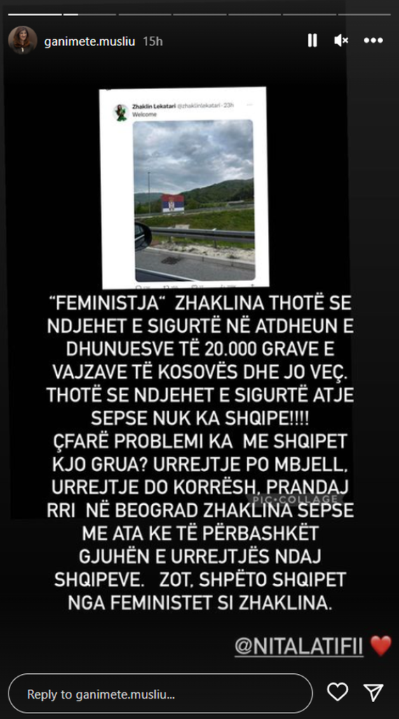 “Feministja” Zhaklina thotë se ndjehet e sigurt në atdheun e dhunuesve të 20.000 mijë grave e vajzave të Kosovës dhe jo veç. Thotë se ndjehet e sigurt atje sepse nuk ka shqipe!! Çfarë problemi ka me shqipet kjo grua? Urrejtje po mbjell, urrejtje do korrësh, prandaj rri në Beograd Zhaklina sepse me ata ke të përbashkët gjuhën e urrejtjes ndaj shqipeve. Zot shpëto shqipet nga feministet si Zhaklina”, ka shkruar deputetja duke etiketuar Nita Latifin në postim.