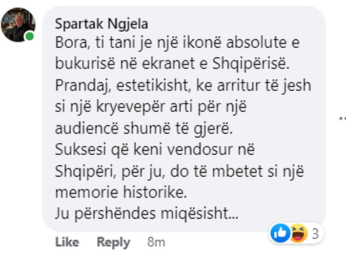 “Bora, ti tani je një ikonë absolute e bukurisë në ekranet e Shqipërisë. Prandaj, estetikisht, ke arritur të jesh si një kryevepër arti për një audiencë shumë të gjerë.