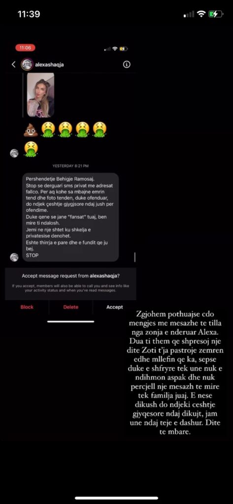 Këngëtarja, Beatrix Ramosaj ka qenë në qendër të vëmendjes për shkak të romacës që nisi në BBV me aktorin e humorit Donald Veshaj duke marrë shumë reagime negative nga ndjekësit e saj. Pas videos që publikoi pak ditë më parë për bullizmin online që i është bërë këto muaj, Ramosaj ka vendosur të publikojë edhe disa nga mesazhet që merr nga ndjekësit në Instagram.