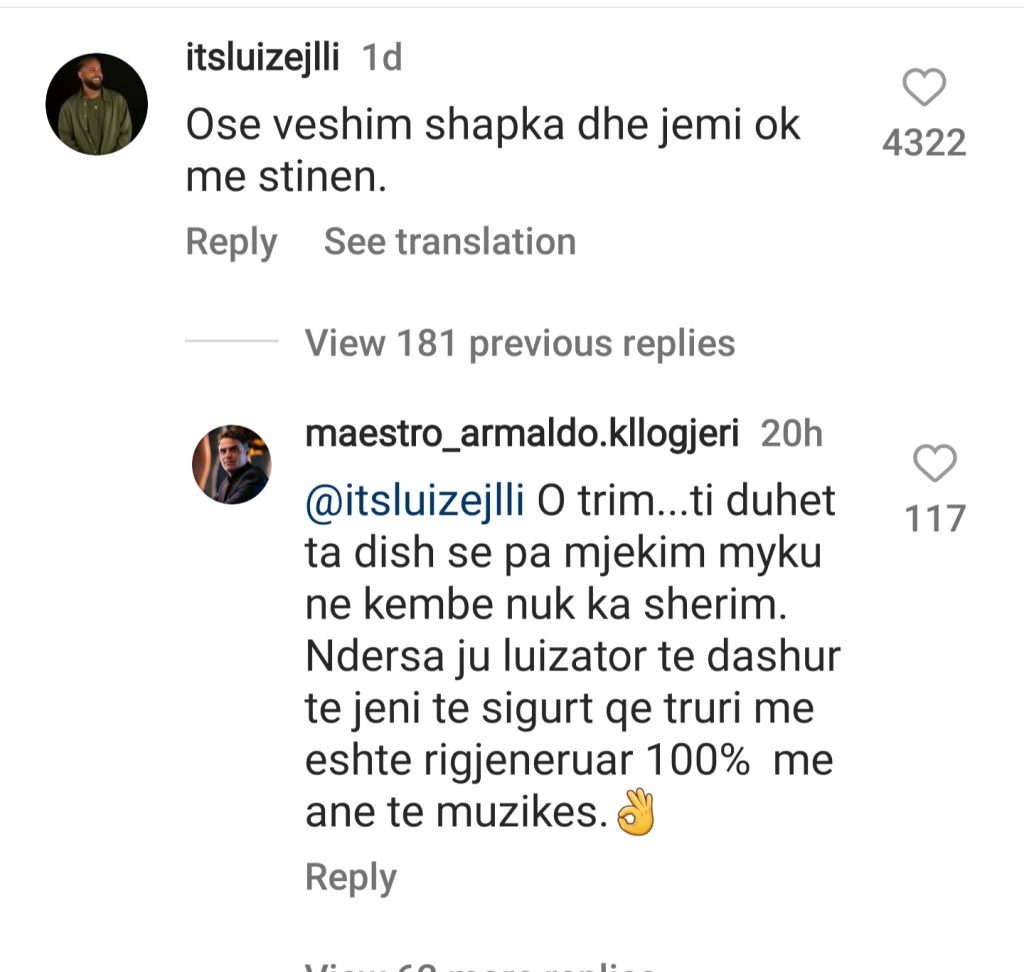 “Ose veshim shapka dhe jemi ok me stinen.” – i komenton Luizi, koment i cili nuk i ka shpëtuar ‚syrit të ndjekesve dhe ka marrë pothuajse dyfishin e pëlqimeve që ka marrë postimi i Armaldos.