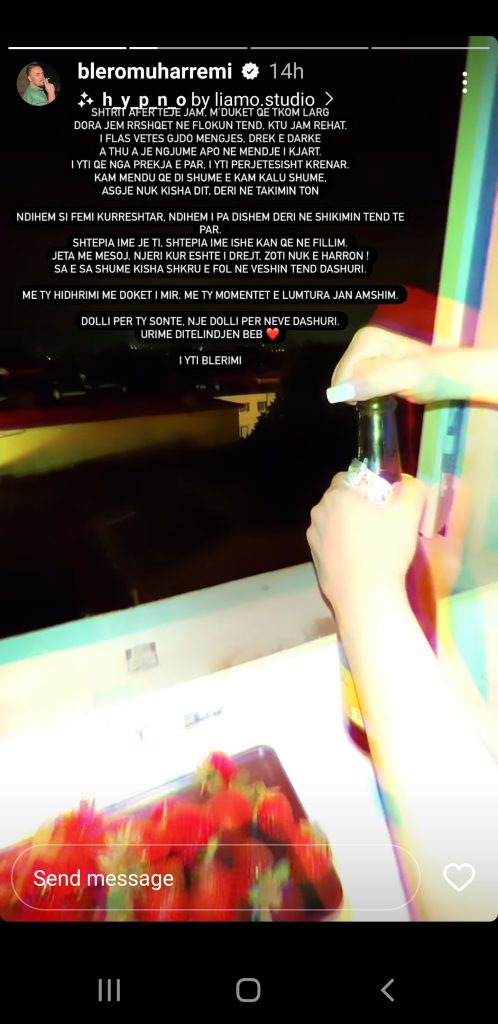 Shtëpia ime je ti. Shtëpia ime ishte që në fillim. Jeta më mësoj. Njeriu kur është i drejt zoti nuk e harron! Sa e sa shumë kisha shkruar dhe folur në veshin tënd dashuri. Me ty hidhërimi me duket i mirë. Me ty momentet e lumtura janë amshim. Dolli për ty sonte, një dolli për neve dashuri. Urime ditëlindjen beb. I joti Blerimi”, ka shkruar Blero.