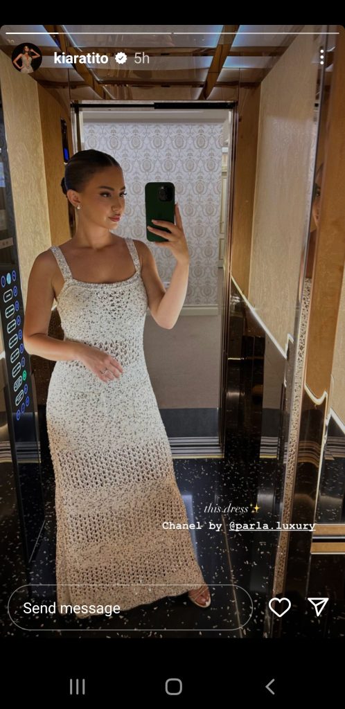 Ndërsa sot Kiara përmes një fotoje në Instagram story ka zbuluar se xhirimet e puntatës së parë kanë përfunduar. Ajo ka postuar një foto ku shihet shumë elegante e veshur me një fustan të gjatë me thurje dhe temina që xixëllojnë.