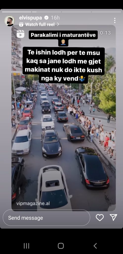 Në postimin e tij, Pupa shkruan: “Parakalimi i maturantëve. Të ishin lodh për të mësuar kaq sa janë lodhur për të gjetur makinat nuk do ikte kush nga ky vend”.