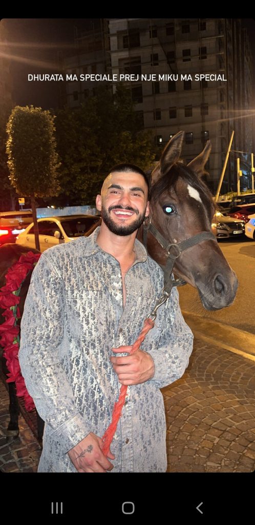“Dhurata më speciale prej një miku special”-shkruan këngëtari, teksa pozon krah dhuratës, e cila është një kalë.
