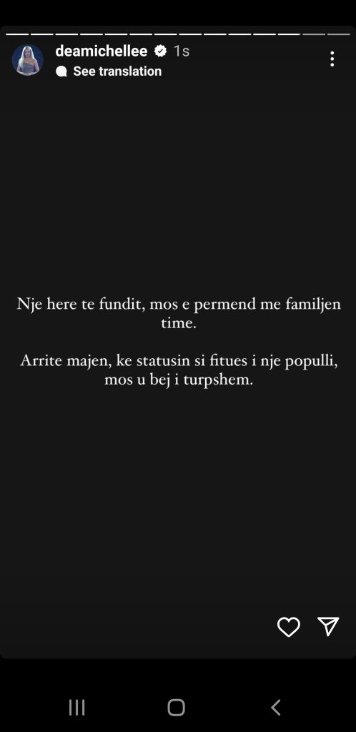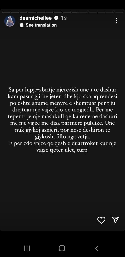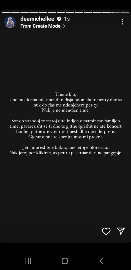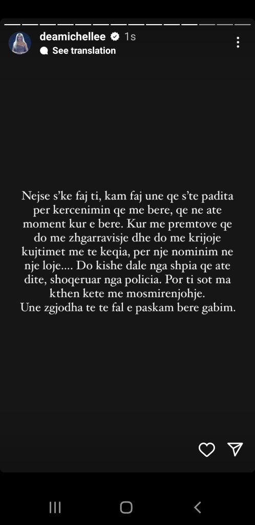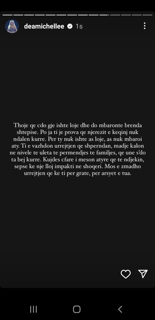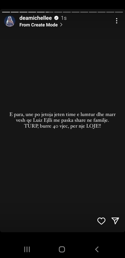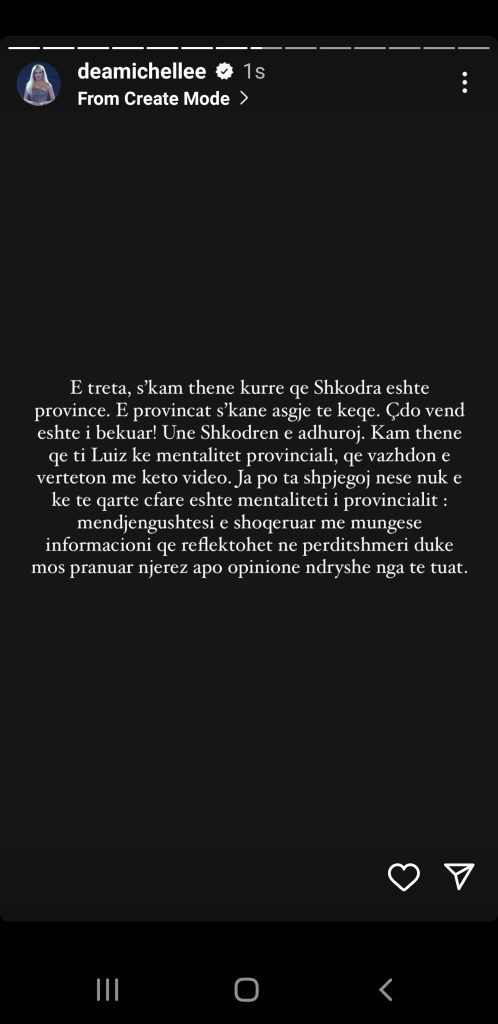 “Tani këtë këngë ia dedikoj një banoreje të shtëpisë së BBVip se më tha je provincial se Shkodra është provincë. Ajo e kishte zakon që kur vinin djem në shtëpi, ia hidhte nga një sy. Edhe unë i kam thënë: kur të jem brenda do loz me gjërat që janë brenda. Ama kur të dal jashtë unë nuk të harroj, kështu që sot dua dhe ndihmën tuaj për me t’i bërë këtë dedikim asaj dhe kujtdo që thotë që Shkodra është provincë,” tha Luizi dhe më pas nisi këngën “O lulija jonë me limona o, kush na ka inatin ju q**** nona o”, ishin fjalët e Luizit të cilave Dea Mishel u është përgjigjur e prerë duke e paralajmëruar të mos merret më me familjen e saj.