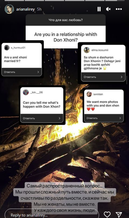 Mirëpo së fundmi Ariana ka zhvilluar një bisedë virtuale me ndjekësit e saj në Instagram, ku një ndër pyetjet nga fansat e ‘zjarrtë‘ të çiftit ishte se ‘a është në një lidhje me Don Xhonin’.