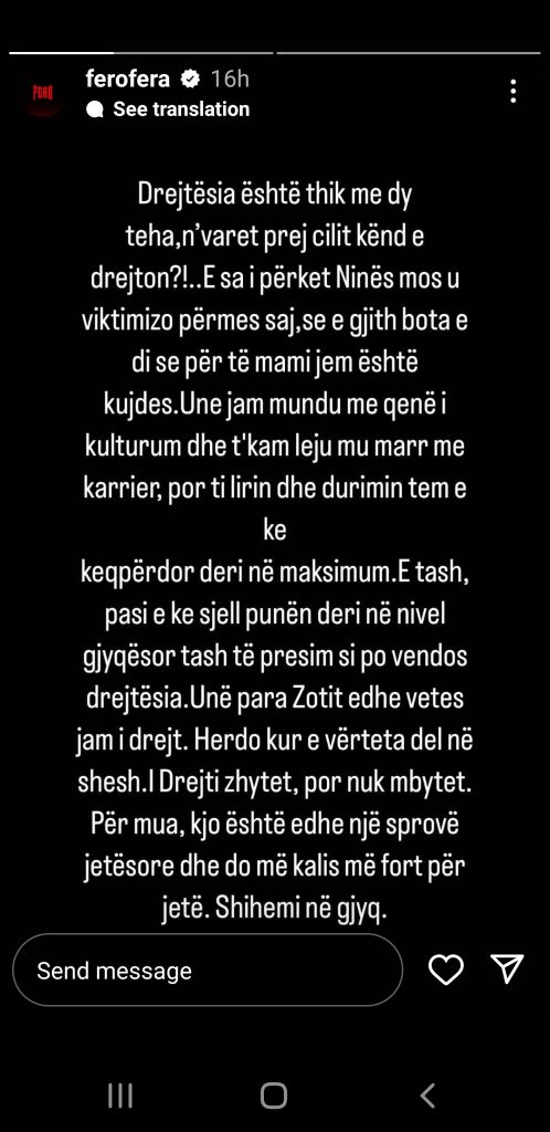 “Drejtësia është thik me dy teha,n’varet prej cilit kënd e drejton?!..E sa i përket Ninës mos u viktimizo përmes saj,se e gjith bota e di se për të mami jem është kujdes.Une jam mundu me qenë i kulturum dhe t’kam leju mu marr me karrier, por ti lirin dhe durimin tem e ke keqpërdor deri në maksimum.E tash, pasi e ke sjell punën deri në nivel gjyqësor tash të presim si po vendos drejtësia. Unë para Zotit edhe vetes jam i drejt. Herdo kur e vërteta del në shesh.I Drejti zhytet, por nuk mbytet. Për mua, kjo është edhe një sprovë jetësore dhe do më kalis më fort për jetë. Shihemi në gjyq”, shkruan Fero.