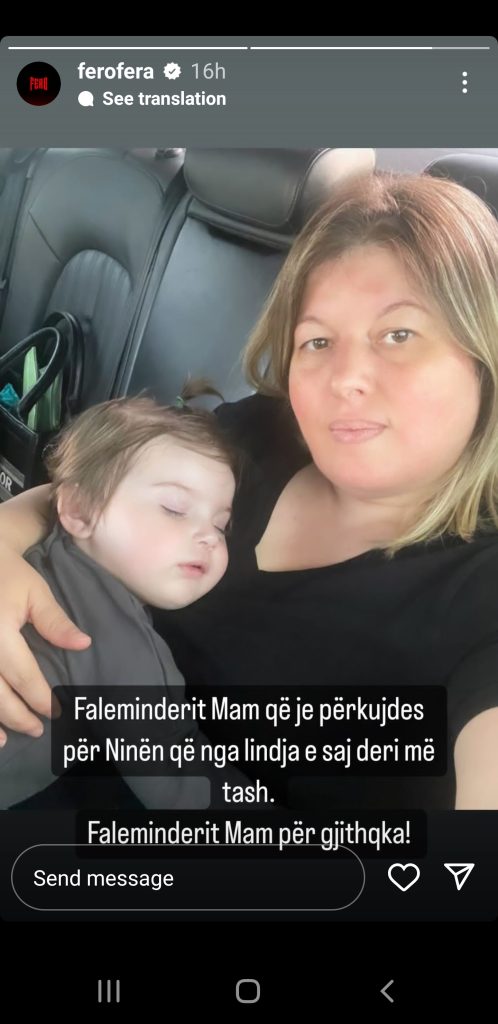 “Faleminderit mam që je përkujdes për Ninën që nga lindja e deri më tash”, shkruan Fero krahas fotos.