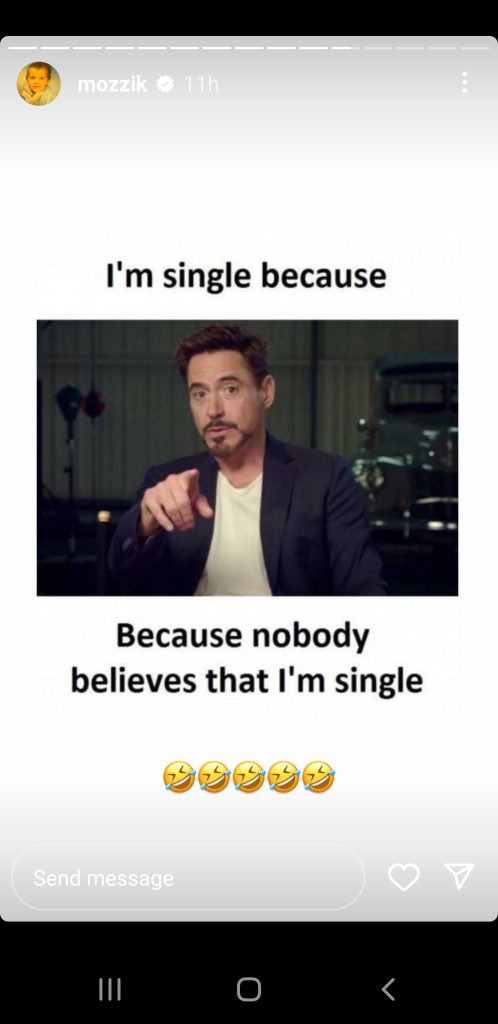 Nëpërmjet një postimi në InstaStory, reperi ka publikuar një foto të tijën ku shkruan se është një ‘Baba beqar’. Duke mos e lënë me kaq, ai publikoi gjithashtu dhe një meme ku shkruhej se ‘ai është beqar pasi nuk e beson askush’.