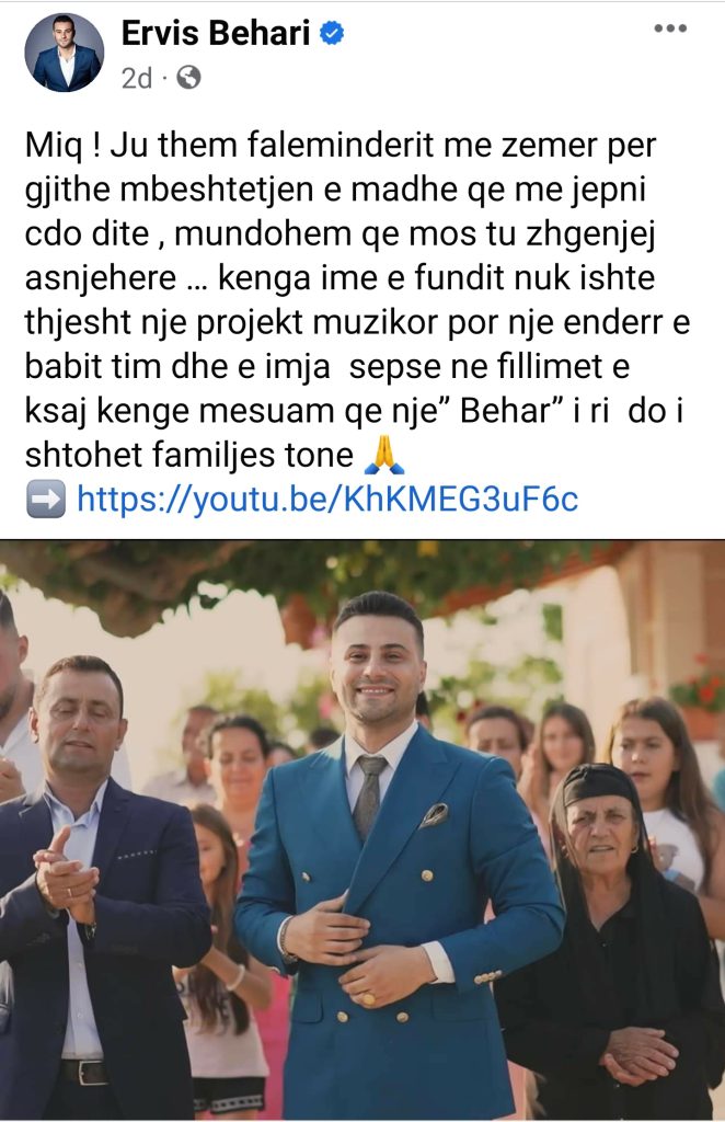 Miq ! Ju them faleminderit me zemer per gjithe mbeshtetjen e madhe qe me jepni cdo dite , mundohem qe mos tu zhgenjej asnjehere … kenga ime e fundit nuk ishte thjesht nje projekt muzikor por nje enderr e babit tim dhe e imja sepse ne fillimet e ksaj kenge mesuam qe nje” Behar” i ri do i shtohet familjes tone.