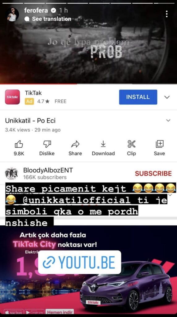 Kjo gjë nuk është pritur mirë nga Fero i cili ka reaguar menjëherë në rrjetet sociale. Teksa ka shpërndarë këngën e rivalit në Instastory ai sërish e quajti ‘picamen’ duke bërë ironi me klikimet.