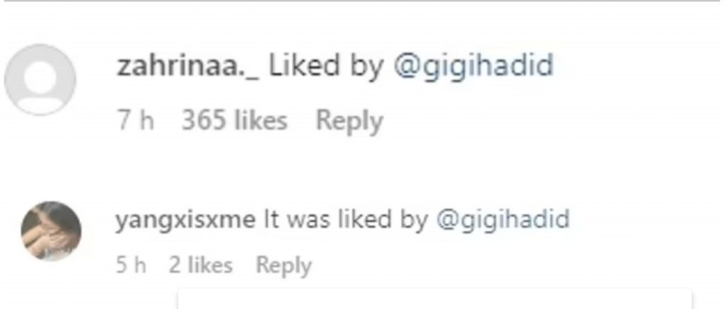 Por ajo që tërhoqi vëmendjen e fansave të tij, ishte se kush e kishte pëlqyer foton e re. Ndjekësit panë se Gigi, ishte në mesin e njerëzve që pëlqyen imazhin e artistit. Kjo vjen pasi, Gigi tregoi tatuazhin e saj teksa ishte e veshur me bikini gjatë pushimeve në fillim të këtij muaji.