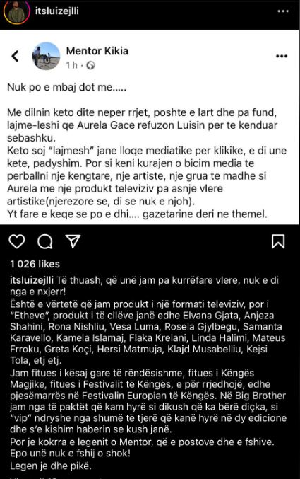 “Nuk po e mbaj dot me….. Me dilnin keto dite neper rrjet, poshte e lart dhe pa fund, lajme-leshi qe Aurela Gace refuzon Luizin për te kënduar së bashku.