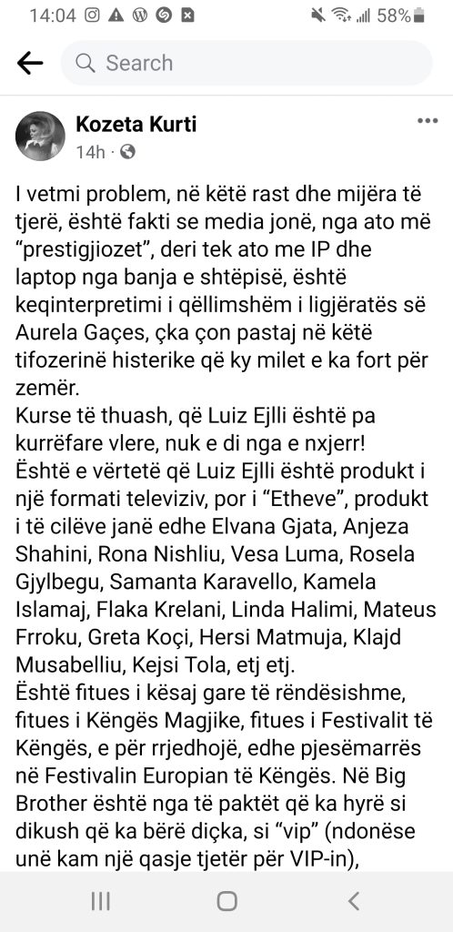 Gazetarja Kozeta Kurti ka reaguar pas “përplasjes virtuale” mes Luiz Ejllit dhe gazetarit Mentor Kikia. Ishte ky i fundit ai i cili e cilësoi Luizin si person pa asnjë vlerë e më pas reagoi edhe vetë personi i përmendur.