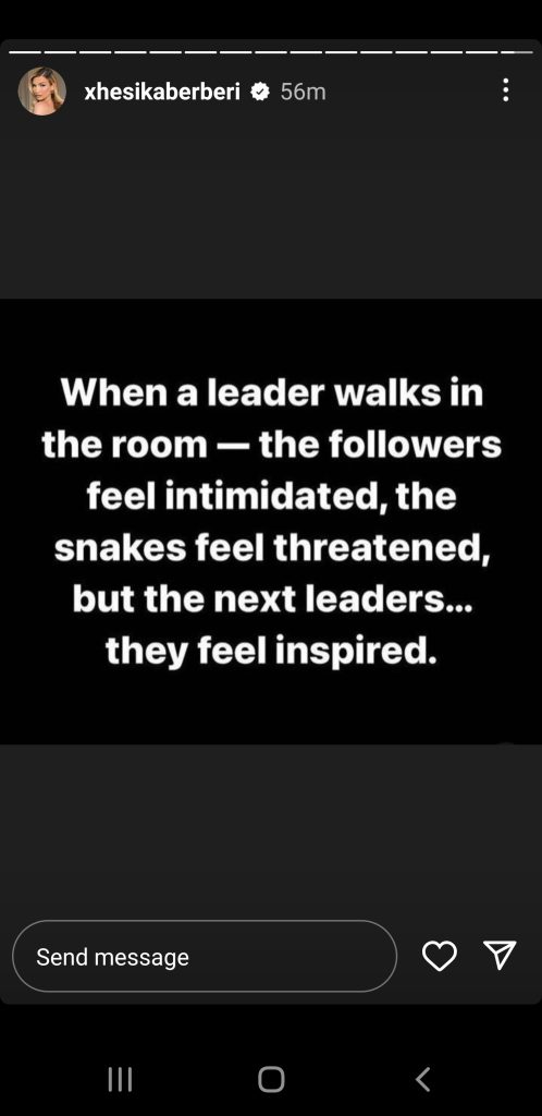 Mirëpo në lidhje me këtë koment ka reaguar vetë Xhesika, e cila ditën e sotme ka postuar një InstaStory një shprehje ‘thumbuese’ ndaj gazetares, duke treguar që komentet negative që merr nga të tjerët nuk e demoralizojnë por thjeshtë e frymëzohozjnë për të ecur më lart.