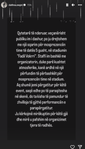 “Stafi im bashkë me organizatorin duke parë kushtet atmosferike kanë ardhur në një përfundim të përbashkët për mosprezencën time në stadium. Aq shumë jemi përgatitur për këtë event saqë edhe po të paraqitesha në skenë do ta kisha të pamundur të zhvilloja të gjithë performancën e parapërgatitur. Ju kërkoj mirëkuptim për këtë gjë dhe uy pafshim në organizimet e tjera të radhës”, ka shkruar këngëtarja në InstaStory.