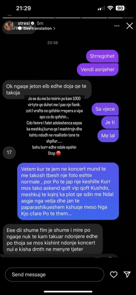 “Jo se du me bo të mirin po kam 1000 virtyte që duhet me i pas një fisnik. Zoti i vraftë në qofshin repera a vipa apo ca do qofshin… Çdo femre i falet adoleshenca sepse ka meshkuj kurva që i mashtrojnë dhe kështu ndodh në realitetin tonë të shpifur….. Bohu burr edhe ndale epshin. Stop”, shkruan Stresi në postimin e tij në “Instastory”.