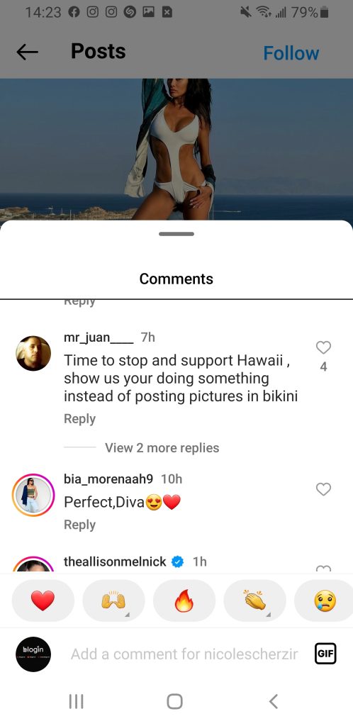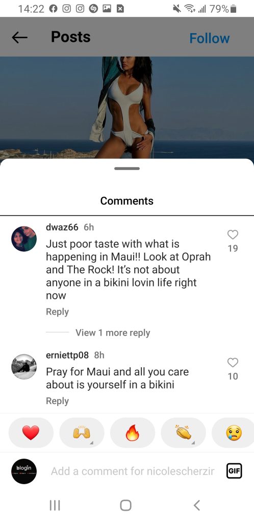 Një ndjekës i Nicole, shkruan bashkangjitur fotos: “Hawaii është përfshirë nga zjarret, ndërsa ti del gjysmë lakuriq, duke treguar jetën e bukur që bën”.