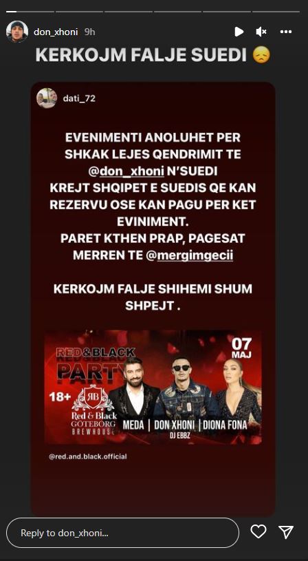 “Evenimenti anullohet për shkak të lejes së qëndrimit të Don Xhonit në Suedi. Krejt shqipet e Suedisë që kanë rezervuar ose kanë paguar për këtë eveniment. Paratë kthehen prapë. Kërkojmë falje, shihemi shumë shpejtë”- shkruhet ndër të tjera në lajmërimin e ripostuar nga reperi.