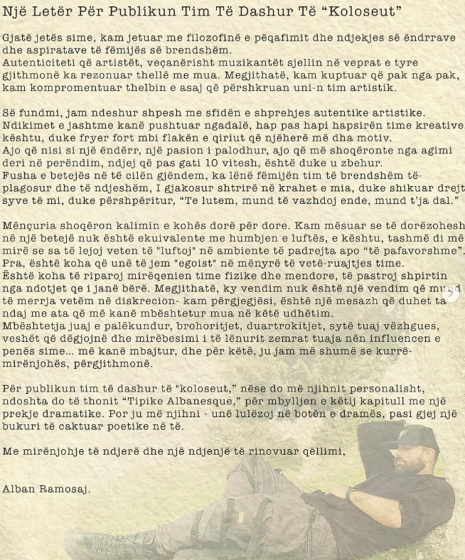“Së fundmi jam ndeshur shpesh me sfidën e shprehjes autentike artistike. Ndikimet e jashtme kanë pushtuar ngadalë, hap pas hapi hapësirën time kreative, kështu duke fryer fort mbi fjalët e qiriut që më dha motiv. Ajo që nisi si një ëndërr, një pasion i palodhur, ajo që më shoqëronte nga agimi deri në perëndim, ndjej që pas gati dhjetë vitesh është duke u zbehur. Fusha e betejës në të cilën gjendem, ka lënë fëmijën tim të brendshëm të plagosur dhe të ndjeshëm”, ka shkruar Albani ndër të tjera.