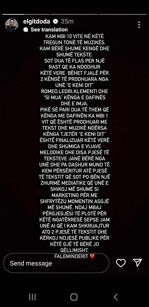 Elgiti në një story mbi të gjitha shkruan: “Pikë së pari dua të them që kënga me Dafinën ka mbi 1 vit që është prodhuar me tekst dhe muzikë ndërsa kënga tjetër “E keni dit” është finalizuar këtë verë”.