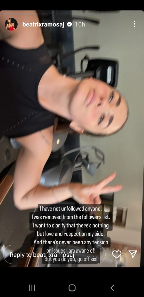 Ky veprim i artistes duket se i ka rënë në sy Beatrix, e cila ka sqaruar nëpërmjet një deklarate në InstaStory se me Dafinën nuk ka pasur asnjë tension dhe se nga ana e saj ka vetëm respekt dhe dashuri. Ndër të tjera në postim, Trixa shprehet se nuk ka bërë unfollow askënd, duke lënë të kuptohet se as ajo vetë nuk e ka kuptuar arsyen e këtij veprimi të Dafinës.