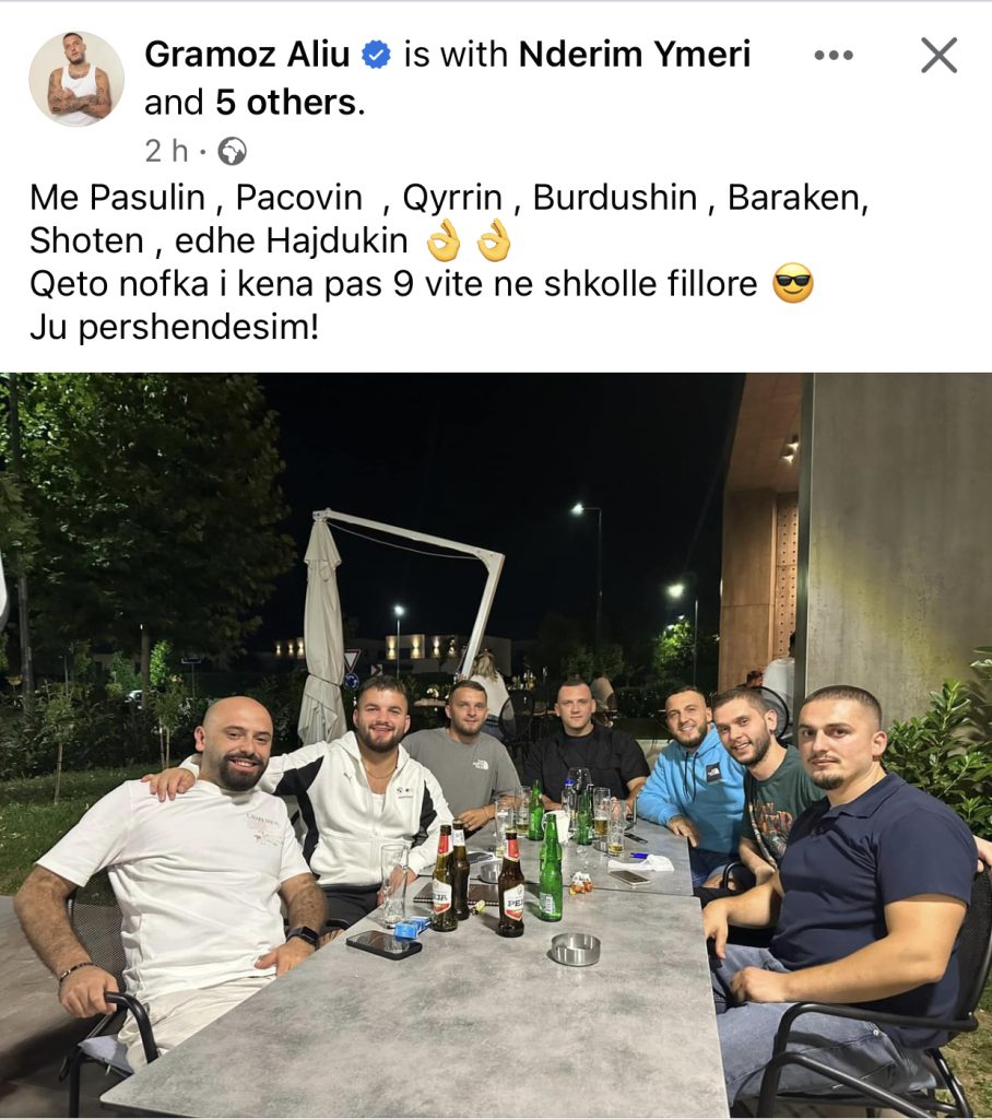 “Me Pasulin , Pacovin , Qyrrin , Burdushin , Baraken, Shoten , edhe Hajdukin. Qeto nofka i kena pas 9 vite ne shkolle fillore.Ju pershendesim”, ka shkruar reperi duke mos zbuluar se cila prej nofkave i përkiste atij.