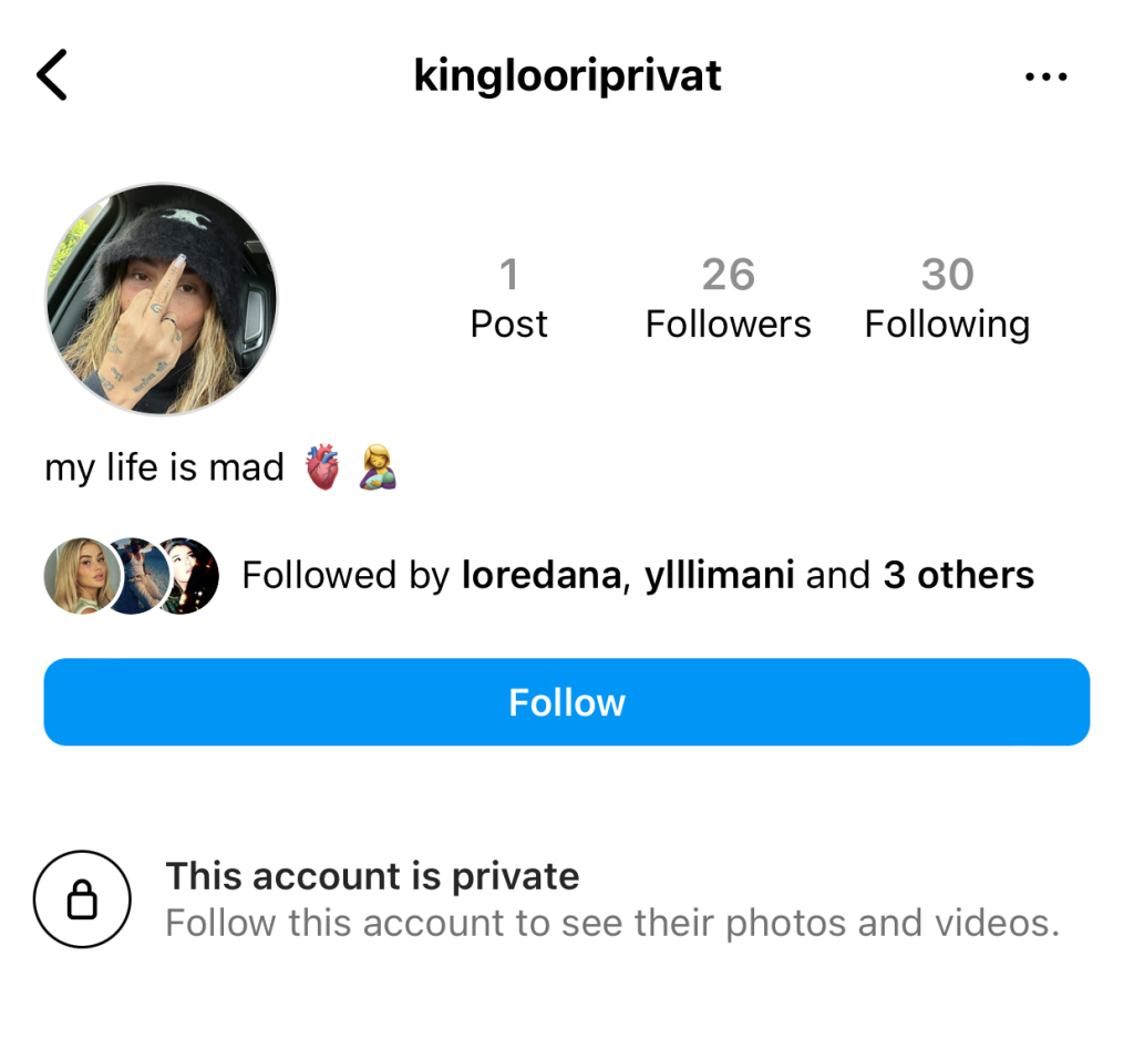 Mirëpo së fundmi, artistja duket se ka hapur një tjetër llogari në Instagram, ku aty deri tani numëron vetem 26 ndjekës dhe i ka vendosur emrin “kingloriprivat”.