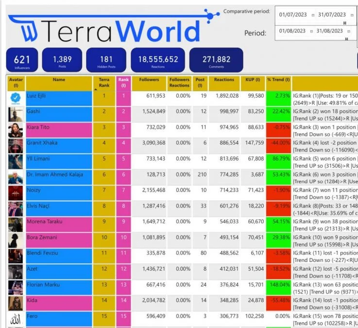 “Terra Data Analitics” ka studiuar profilet e 621 personazhe të njohur shqiptarë në “Instagram”, të cilët kishin 1389 postime gjatë muajit gusht.