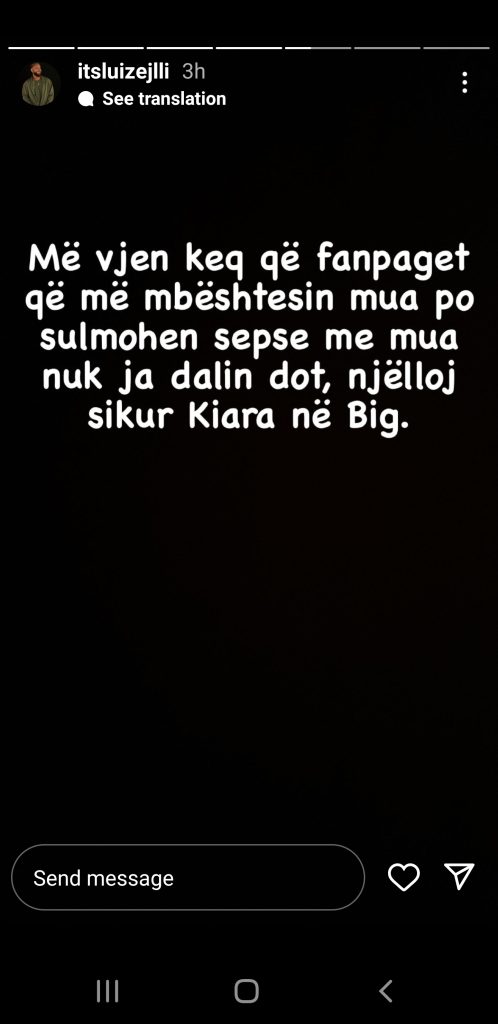 “Më vjen keq që fanpaget që më mbështesin mua po sulmohen sepse me mua nuk ja dalin dot, njëlloj sikur Kiara në Big”.