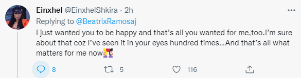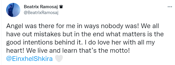 Beatrix ka bërë deklaratën e papritur për Einxhel në Twitter ku mes tjerash shprehet: “Einxhel ishte aty për mua kur askush tjetër nuk ishte. Ne kemi gabimet tona por në fund çfarë vlen janë qëllimet e mira prapa tyre. E dua me gjithë zemrën. Ne jetojmë dhe mësojmë, kjo është moto”.