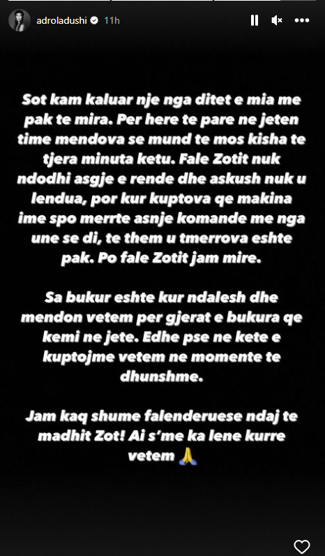 Por falë Zotit jam mirë. Sa bukur është kur ndalesh dhe mendon vetëm për gjërat e bukura që kemi në jetë! Dhe pse ne këtë e kuptojmë vetëm në momente të dhunshme. Jam kaq shumë falenderuese ndaj të madhit Zot. Ai s’më ka lënë kurrë vetëm,”- ka shkruar Adrola.