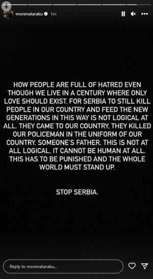 Mes tyre është modelja dhe këngëtarja e njohur, Morena Taraku, e cila përmes një shkrimi të publikuar në InstaStory, ka thënë se nuk është aspak e pranueshme ajo çfarë pala serbe po bën.