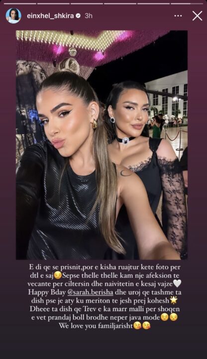 “Gëzuar ditëlindjen Sarah dhe uroj ta dish pse je aty ku meriton të jesh prej kohësh. Dhe ta dish Trev e ka marrë malli për shoqen e vet prandaj boll brodhe nëpër java mode. Ju duam familjarisht”, shkruan Einxhel bashkangjitur një fotoje ku shihet dyshja teksa pozojnë pranë njëra-tjetrës.