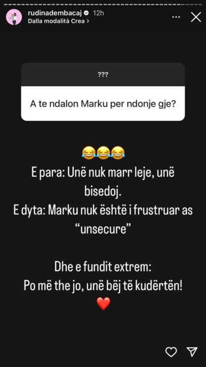 “E para: Unë nuk marr leje, unë bisedoj. E dyta: Marku nuk është i frustruar as ‘unsecure’. Dhe e fundit ekstrem: Po më the jo, unë bëj të kundërtën”, është përgjigjur aktorja e njohur, e cila e ka shoqëruar gjithashtu me një emoji duke qeshur dhe zemre të kuqe.