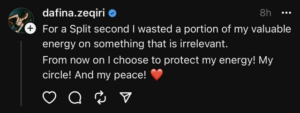“Për një sekondë harxhova energjinë time të çmuar për gjëra të parëndësishme. Tani e në vijim, zgjedh të mbroj energjinë time! Rrethin tim! Dhe paqen time!”.