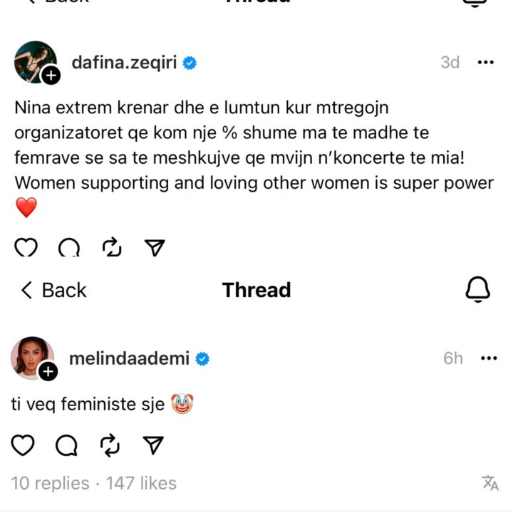 Kjo e fundit gjatë një interviste tregoi se si nisën hatërmbetjet mes tyre, ndërsa nuk kaloi shumë kohë dhe Dafina reagoi përmes një portimi në “Threads”.