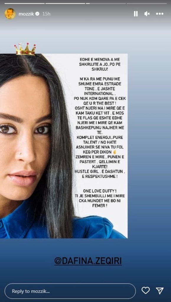 “Edhe mendova, ta shkruaja apo mos ta shkruaja. Më ka rënë të punoj me shumë emra të estradës sonë, jashtë dhe në botë por nuk rri dot pa e përmendur që ti je më e mira. Eshtë njeriu më i mirë që kam takuar këtë vit dhe mos të them që është edhe njeriu më i mirë që kam bashkëpunuar ndonjëherë. Komplet energji, talent i pastër, pa urrejtje. Nuk e dëgjova ndonjëherë të flasë keq për dikë. Zemrën e mirë, punën e pastër, qëllimin e qartë, e vendosur për sukses, e dashur, e respektueshme. Një dashuri Duffy. Ti je shembulli më i mirë se cfarë mundet të bëjë një femër”, ka shkruar Mozzik.