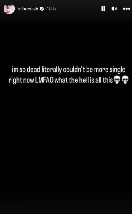 Billie Eilish shkroi në Instagram Stories për të theksuar se ajo është beqare dhe shprehu habi për thashethemet e fundit të takimeve rreth saj. Postimi i saj, i shoqëruar nga dy emoji me kafkë, dukej se ishte në përgjigje të një historie të fundit që pretendonte se ajo ishte e lidhur në mënyrë romantike me artistin e famshëm të tatuazheve, David Enth.