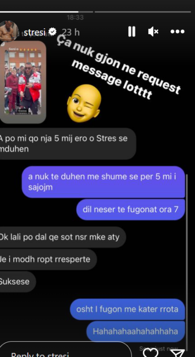 “Çfarë nuk dëgjon me “request messages”. Me lot”, shkruan Stresi bashkangjitur një bisede të publikuar në Instastoru, ku shihet dikush që i ka kërkuar artistit 5 mijë euro.