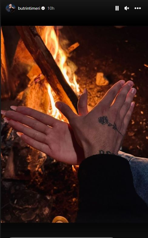 Në foton e postuar duket qartë dora e tij dhe e një femre misterioze ndërsa bëjnë simbolin e shqiponjës në një ambient romantik pranë një zjarri.