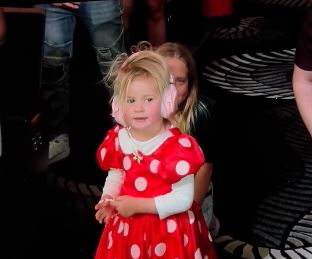 Vogëlushja, e cila ishte e veshur me një veshje Minnie Mouse me kufje rozë, u pa duke kërcyer dhe kënduar me babanë e saj gjatë koncertit.