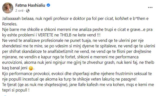 Moderatorja Fatma Haxhialiu ka shpërthyer ndaj të gjithë kritkëve të performancës së Ronela Hajatit në Eurovision, duke i dalë në mbrojtje kësaj të fundit.